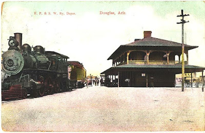 Bisbee’s Copper Queen mine built the Arizona & Southwestern railroad 36 miles to Fairbank (west of Tombstone) in 1888-1889 and connected with the SPRR at Benson five years later. After Phelps-Dodge acquired the mine, it recreated the railroad as the El Paso & Southwestern in 1901, building to Douglas that year and El Paso the next. This wooden depot was replaced in 1913 by a grand structure that still stands. The EP&SW was acquired by the SPRR in 1924. The name was dropped in 1955 and service ceased by the end of 1961. The tracks were taken up beginning in 1963 and the depot is now home to the Douglas police department.